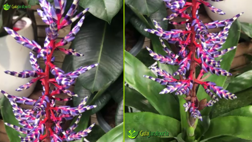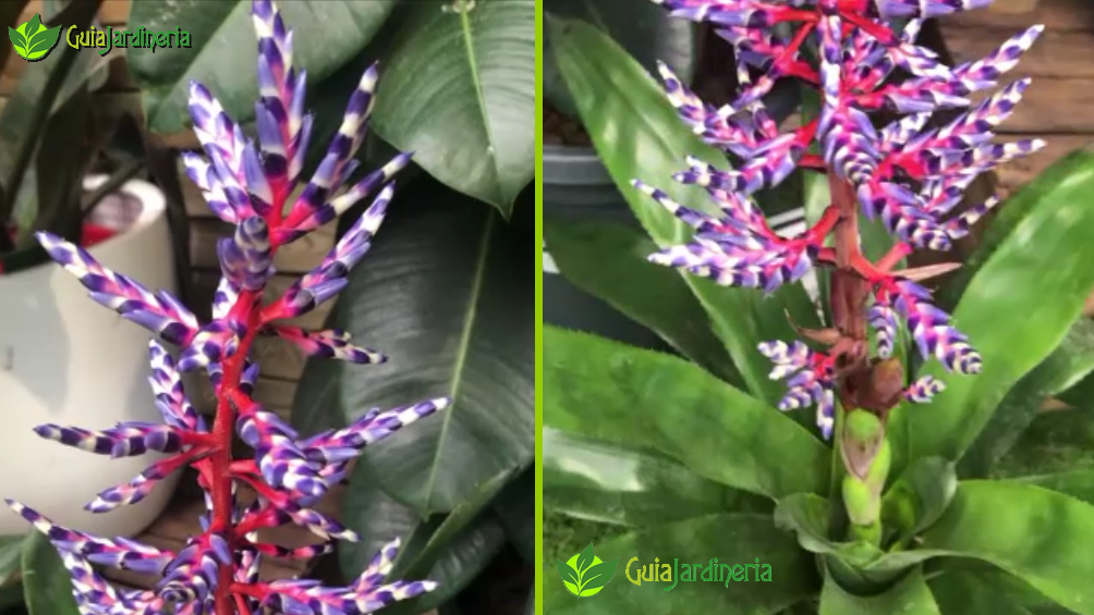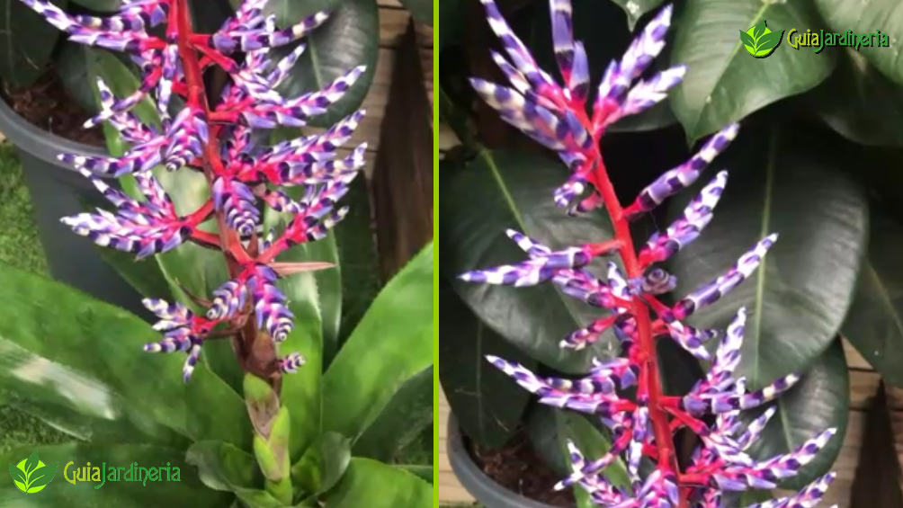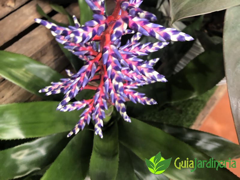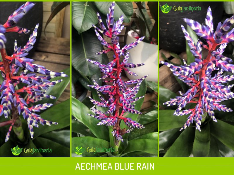La inflorescencia que porta sus flores color azul y morado con base blanca en tallo rojo y con el verde intenso de sus hojas hace a la Aechmea Blue Rain una planta espectacular.